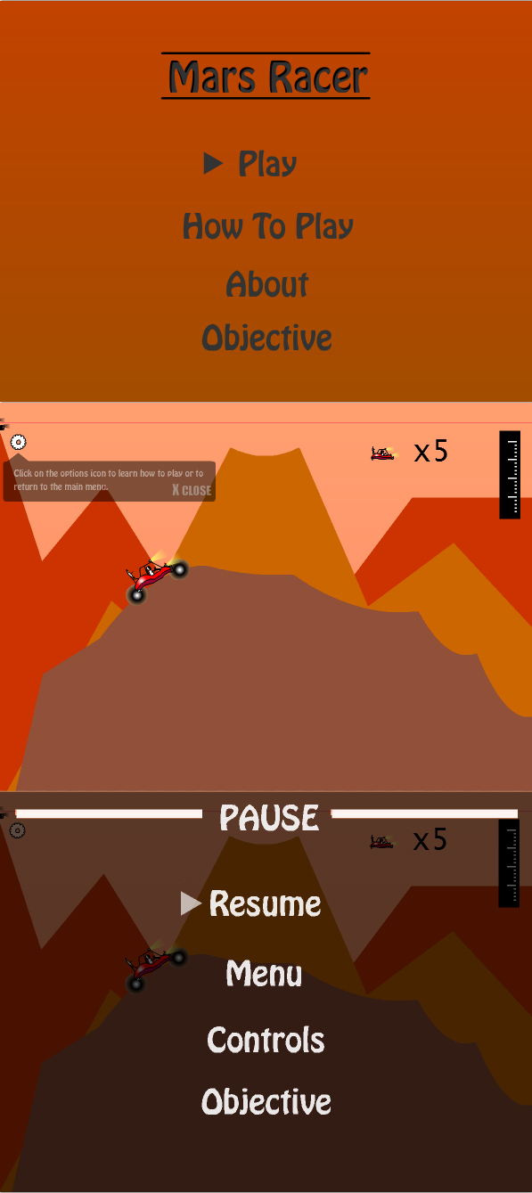 Mars Racer was the first game that I attempted a full game menu system, in-game and out. While the main menu contains the same information as the other menus I have developed, the in-game menu presented a way to provide extra information to the player without the need to restart the game. In this case, Mars Racers in-game menu provides the user with a means to exit the game, review the game controls, and the objective of the game.