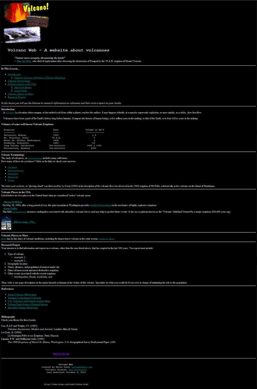 Volcano website was the very first website that I created. Creating the Volcano Website taught me the basics of HTML and CSS coding. I really liked creating this website because I was able to throw in extra CSS styles to give the page some flair. Making this website for my Boulder CTEC class is what initially got me interested in web design and development as a career. Right away I understood what I was doing and I was never lost in all of the syntax and vocabulary. This website also helped me see what looked good and what didn't look good when it came to design choices like color choice, font sizes, link states, and anchor links. The purpose of this website was to begin building our knowledge of HTML and CSS coding, as well as, design choices involving user centered design (UCD) and user interface.